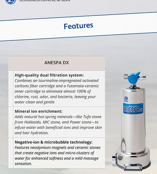 The exclusive ANESPA Home Spa System transforms your ordinary bathroom into a natural hot spring resort. ANESPA produces a continuous stream of healthy ionized mineral water. It removes chlorine and other harmful substances in your tap water, and adds safe, moisturizing minerals that are healthy for your skin and hair. Enjoy a lovely shower or bath in ANESPA hot spring water!